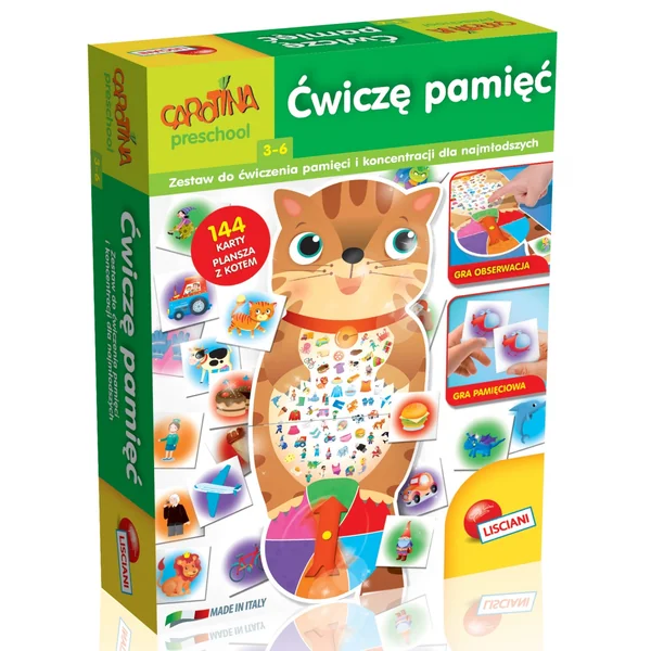 Gra edukacyjna "Ćwiczę pamięć Carotina" marki Lisciani to zestaw zawierający 144 karty, spinner oraz planszę w kształcie kota, które wspierają rozwój umiejętności obserwacji i kreatywności. Gra oferuj...