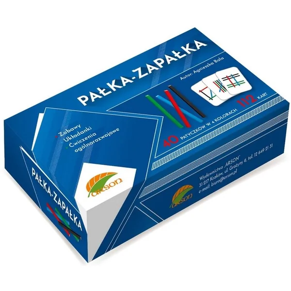 Pałka Zapałka to zestaw kart edukacyjnych marki Arson, wspierający rozwój analizy wzrokowej i koncentracji u dzieci. Zestaw zawiera 112 wzorów (2 talie po 56 kart) i 40 kolorowych patyczków. Umożliwia...