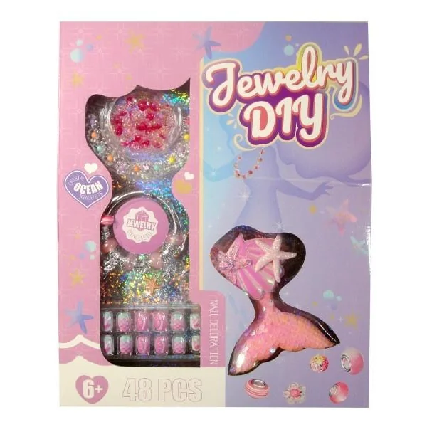 SWEDE - Biżuteria DIY to kreatywny zestaw składający się z 48 elementów, w tym koralików do nawlekania, bransoletki z przywieszkami oraz akcesoriów takich jak sztuczne paznokcie i spinka do włosów. Ze...