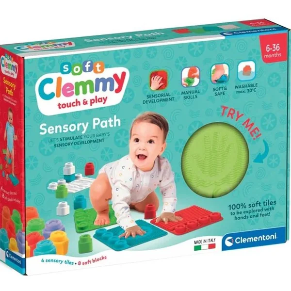 Clemmy Soft Ścieżka sensoryczna marki Clementoni to zestaw dużych, miękkich elementów z bezpiecznej gumy o zróżnicowanych teksturach, stymulujących percepcję dotykową i rozwój zdolności manualnych nie...