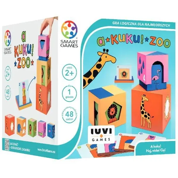 Smart Games A kuku! Zoo to edukacyjna gra dla dzieci przedprzedszkolnych rozwijająca zdolności językowe i pojęcia przestrzenne. Zawiera 5 kartonowych klocków, 48 kart z zadaniami oraz broszurę z rozwi...