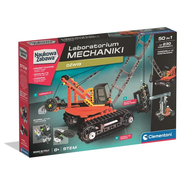 Clementoni - Laboratorium Mechaniki Dźwig (50402) to zestaw edukacyjny do samodzielnego składania dźwigu gąsienicowego. Realistyczne ruchy, obrót kabiny i nachylenie ramienia za pomocą cięgien pozwala...